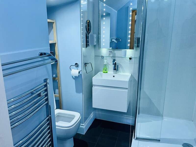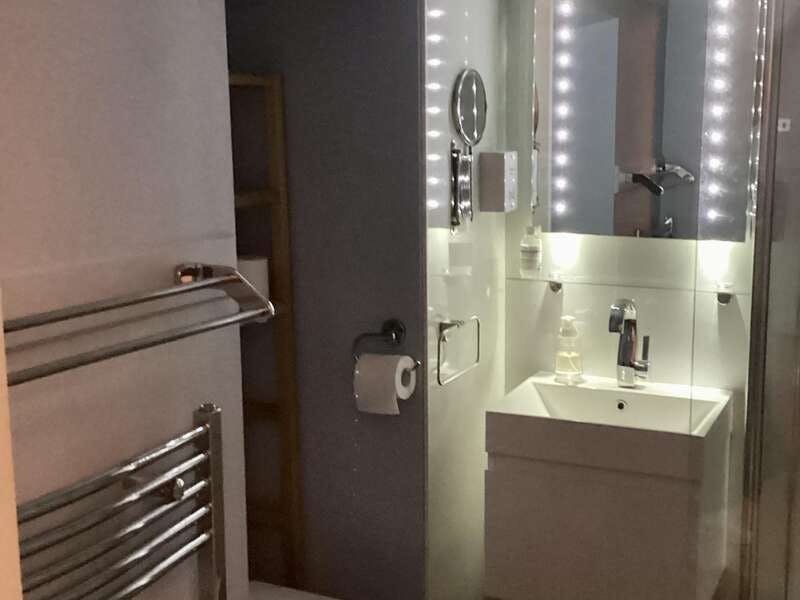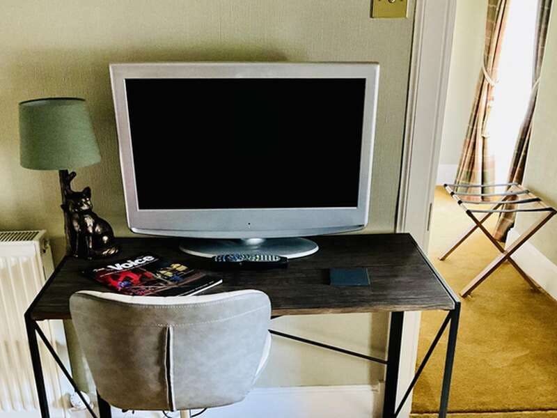 This is definitely our most spacious, supremely decorated and best view suite! It has a bedroom with a super king bed (that can also be converted to twin beds), a nice sized bathroom with shower and a separate sitting room that’s cozy and private. Both rooms have an absolutely beautiful view of the loch, the mountains, the gardens and the famous Ben Arthur (the Cobbler). The sitting room also has a velvet sitting chair which converts to an extra bed, which we’ll add a memory-foam topper to for extra comfort. So if you have a child or an extra adult with you, the set-up provides privacy for a couple in the bedroom as well as for your child, friend or adult relative in the sitting room. Even if they don’t want to share a bathroom with you, they have their own private door and can go downstairs to use our overflow bathroom with shower. Each room has its own television as well. A romantic luxurious stay for a couple, or a suite that will provide extra room to spread out for a small family or a group of friends.