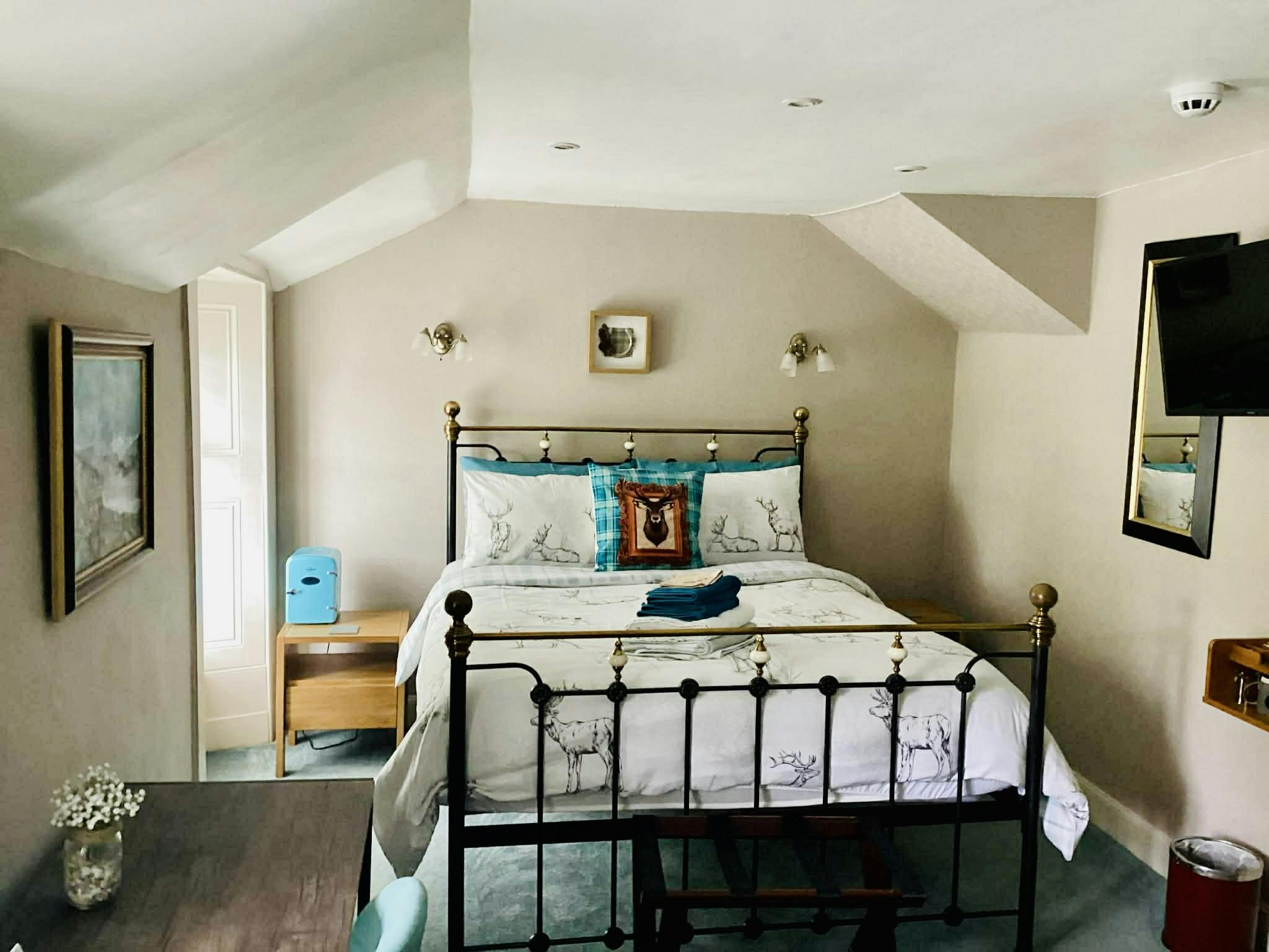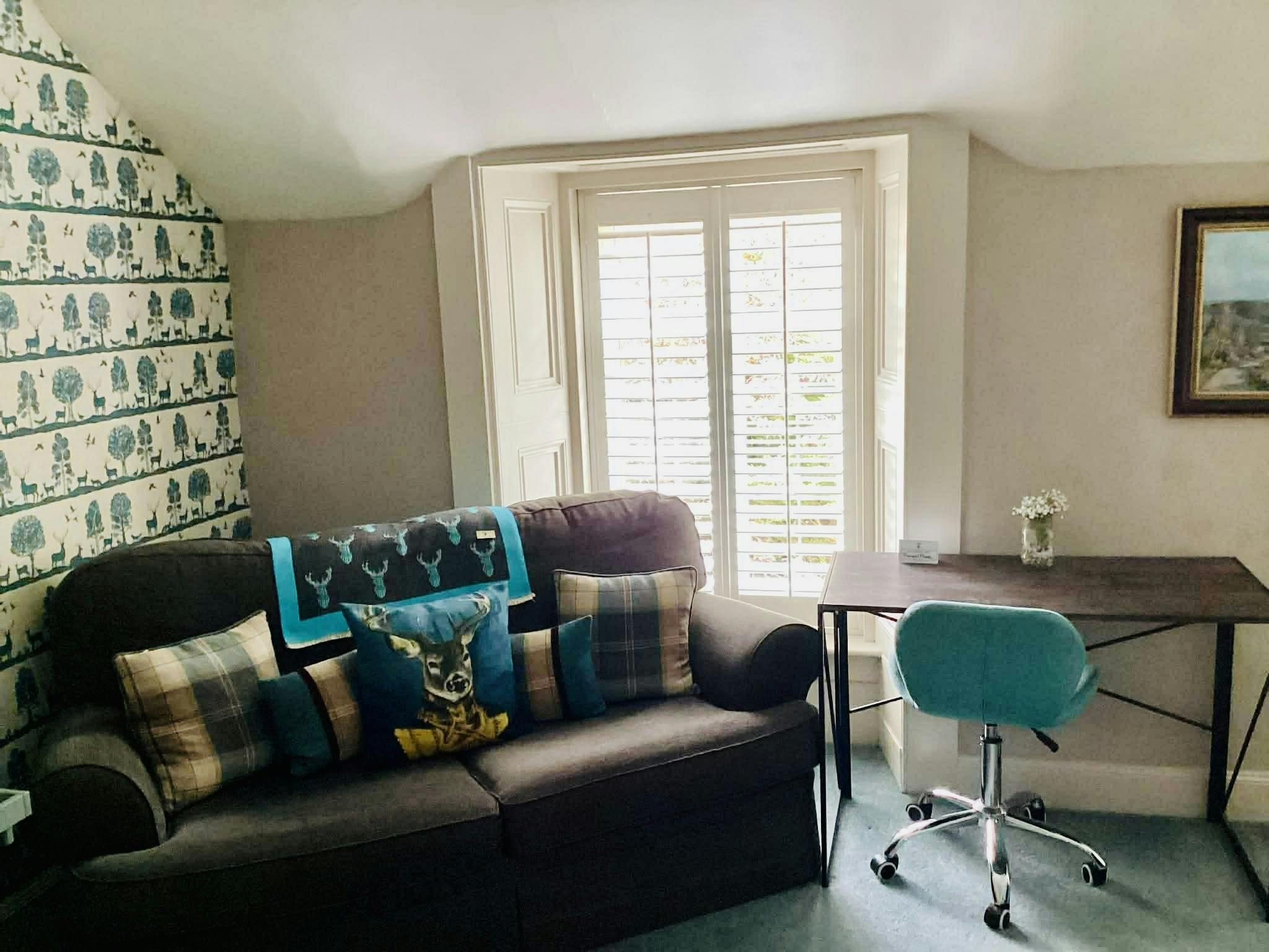 En-suite Room with shower. Very private room with a king size brass bed plus a pull out double sofa in case you have a child or extra adult staying with you..Views to the side garden of house show our greenhouse. You might even catch a glimpse of our stags and the little fox who we’ve fondly named Moxy! This room is truly peaceful and quiet, located at the back of the house upstairs. You’ll sleep soundly!