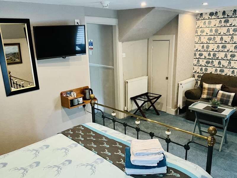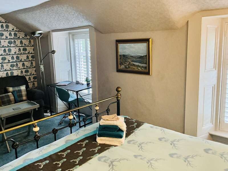En-suite Room with shower. Very private room with a king size brass bed plus a pull out double sofa in case you have a child or extra adult staying with you..Views to the side garden of house show our greenhouse. You might even catch a glimpse of our stags and the little fox who we’ve fondly named Moxy! This room is truly peaceful and quiet, located at the back of the house upstairs. You’ll sleep soundly!