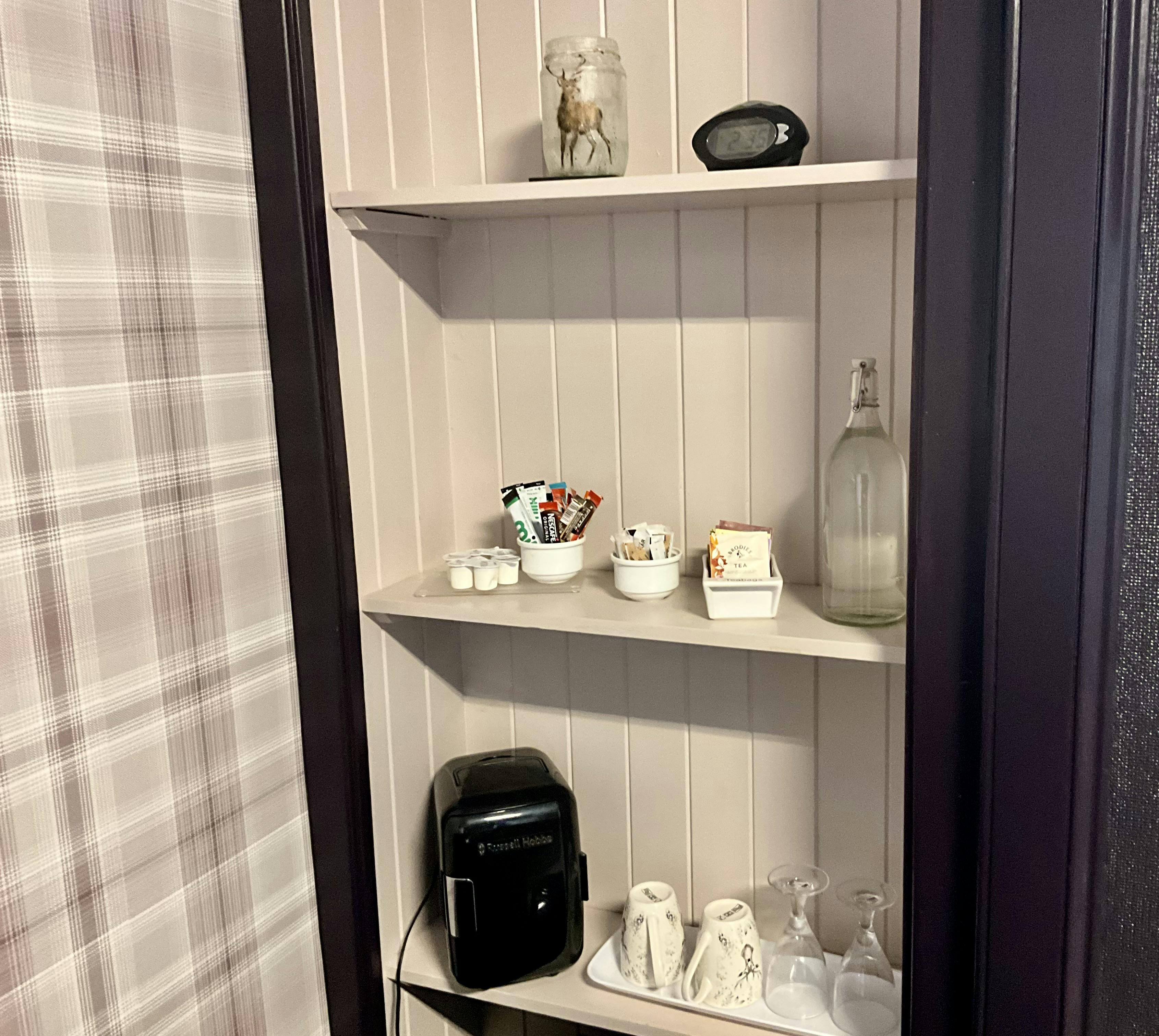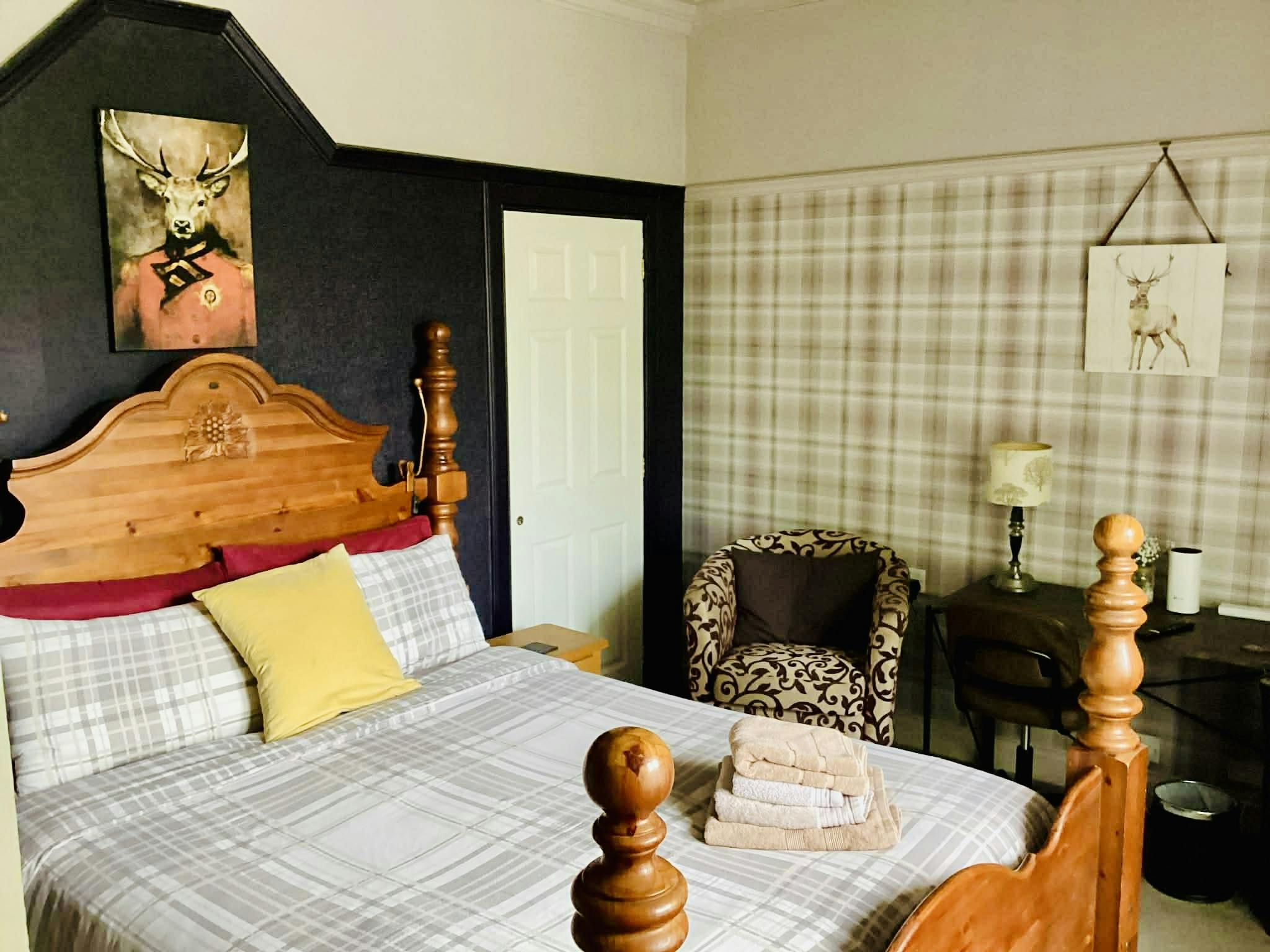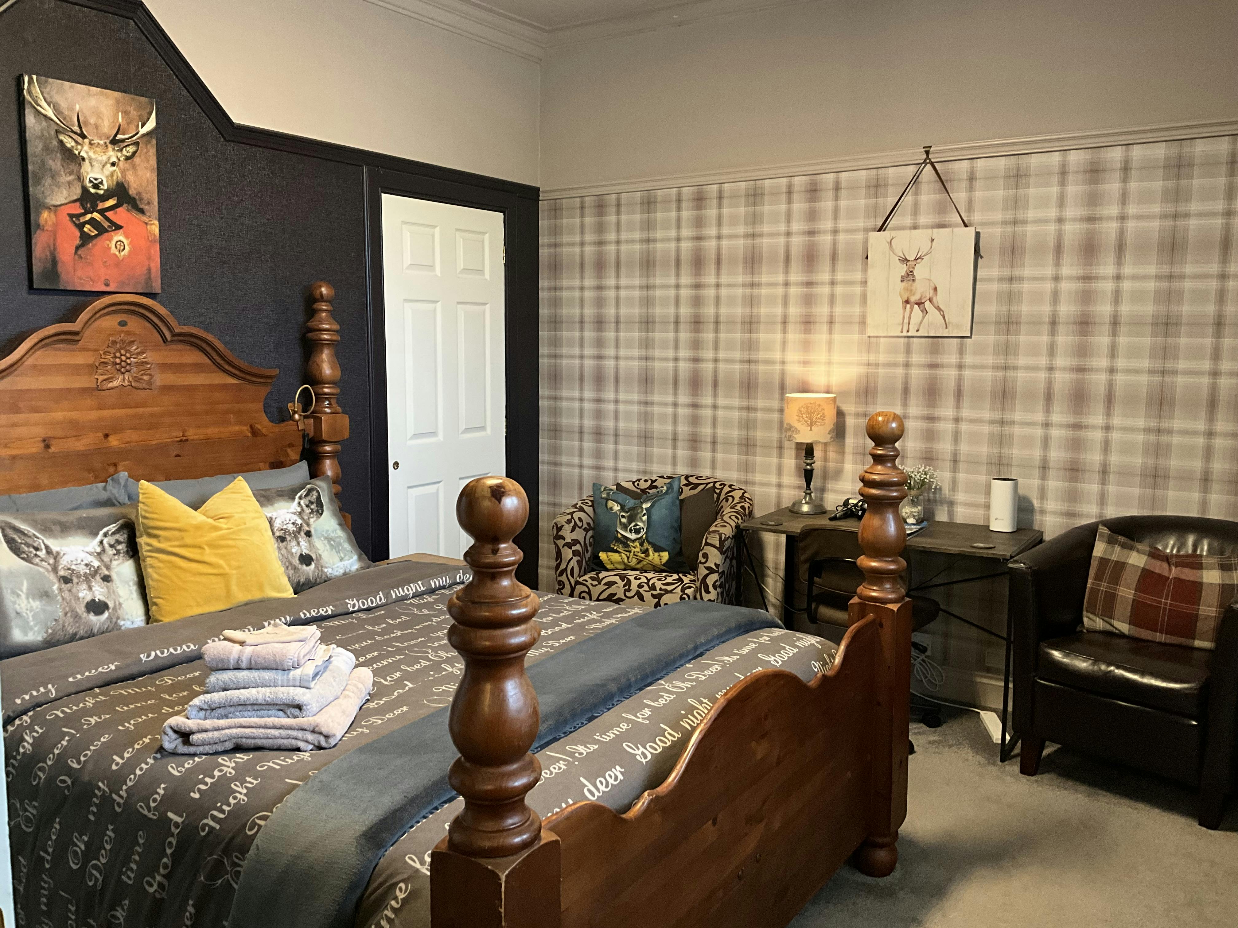 En-suite Room with shower. This is a room unto itself on the ground floor, away from the other rooms in the BNB. It’s light and airy with stag accents and tartan wallpaper. The room has a king size antique wooden poster bed with windows ahead that have views of the Arrochar Alps, the garden and the Loch. It also has a working desk, a closet for extra storage space, a luggage rack, and a door right outside the room which you are welcome to access to come and go. From the front door, the room can be accessed through the guest lounge and gift shop on the ground floor.
